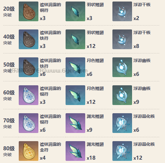 6、80级:谧林涓露的金符x4、渊光鳍翅x18、浮游晶化核x12