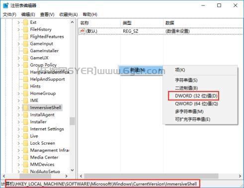 HKEY_LOCAL_MACHINE\SOFTWARE\Microsoft\Windows\CurrentVersion\ImmersiveShell,在右侧新建一个DWORD(32位)值;