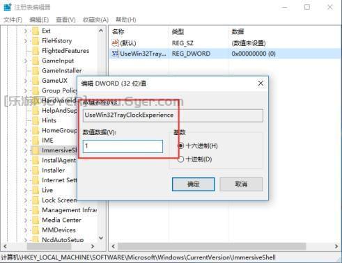 3、重命名该键值为UseWin32TrayClockExperience,双击打开并将数据数值修改为1,确定保存;