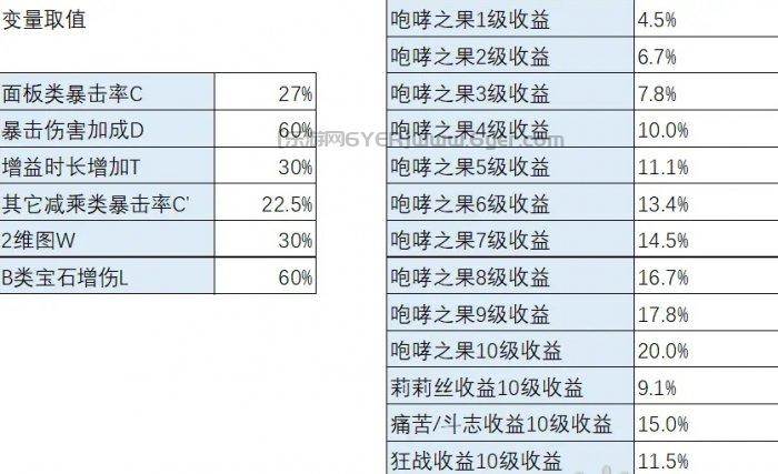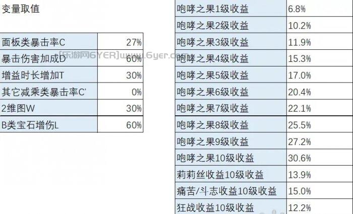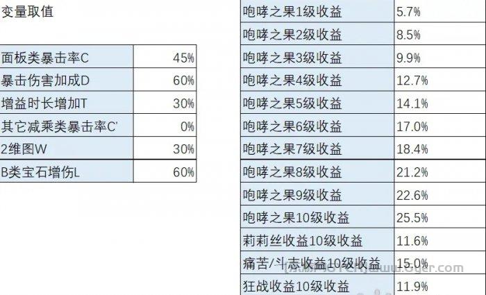 看一下变量,影响咆哮之果收益的变量比较多,先是和莉莉丝一样的当前的面板暴击率C,暴击伤害加成(包含破甲)D,增益时长增加T,以及是否有其它减乘类暴击率C’。然后咆哮之果还可以受到2维图W的加成。为了对比狂战士还要加入B类宝石增伤L。最后因为想对比各等级咆哮之果的效果,将咆哮之果提供的暴击率定为P。