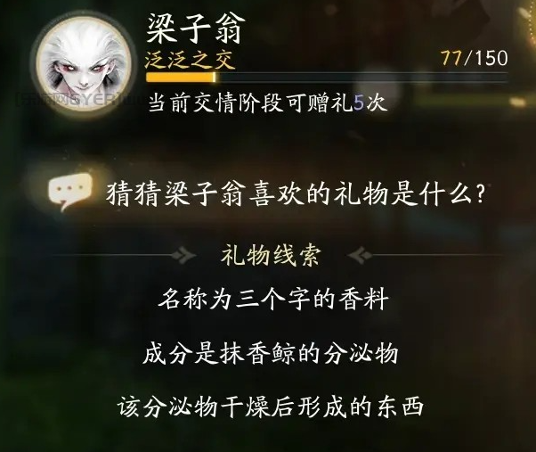礼物线索二:名称为三个字的香料,成分是抹香鲸的分泌物,该分泌物干燥后形成的东西。