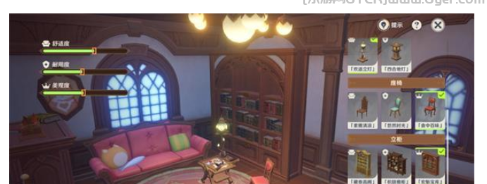 1.原神兔叽的跳跳树屋点击布置,选择亮金摇篮、从容淡蓝、舒坐泛论、睡前故事。