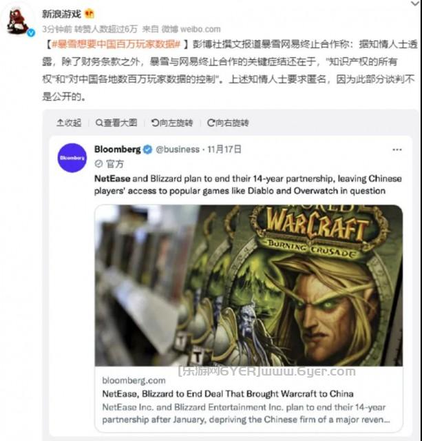 ▲图:彭博社撰文称暴雪与网易终止合作的关键症结还在于“知识产权的所有权”和“对中国各地数百万玩家数据的控制”