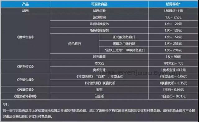 ▲图:网易发布的暴雪游戏相关的“可退款商品”的具体范围及退款标准