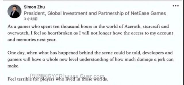 当时,网易游戏全球投资及合作总裁朱原曾发文表示,“作为一个曾在艾泽拉斯、星际争霸、守望先锋的世界中度过了成千上万小时的老玩家,我也对在明年即将失去我的账号感到心痛。有朝一日,当一切都尘埃落定,内幕被揭开之时,开发者和玩家们将对 ‘一个傻瓜能造成多大的伤害’ 产生全新级别的认知。我对所有要面对此事的玩家感到悲哀。”