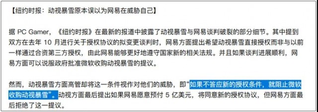 具体来说,就是动视暴雪、网易的合约期限即将到期,谈续约时,网易希望动视暴雪这次可以直接给自己游戏授权(之前是通过合资第三方授权),这样网易能够更好地遵守国家新的相关法规。如果进展顺利的话,网易还可以为动视暴雪当说客,说服政府批准微软收购动视暴雪。