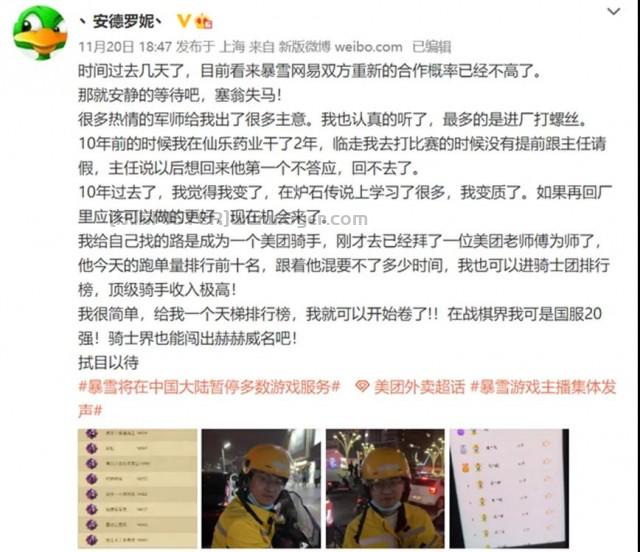 ▲图:《炉石传说》主播安德罗妮发微博表示《炉石传说》关服后要去做美团外卖骑手
