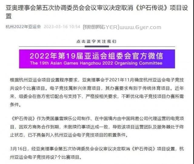 ▲图:亚奥理事会第五次协调委员会会议审议决定取消《炉石传说》项目设置”