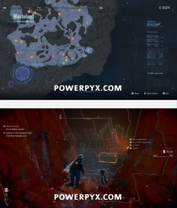 4、以上这些前置条件都完成后,前往废土东南边的水池处(下图所示位置),水下有个洞,游进洞里即可到达水底很深的地方,在水底找到箱子,用刚才的密码【θθθβββ】开启箱子,获得【神奇鱼饵】,返回告示板提交委托即可。