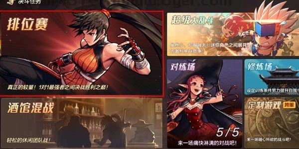 2、 进入后就可以看到六大玩法模块,其中排位赛就是最传统最经典的1v1对战模式,也是最主要的奖励获取来源,点击进入。